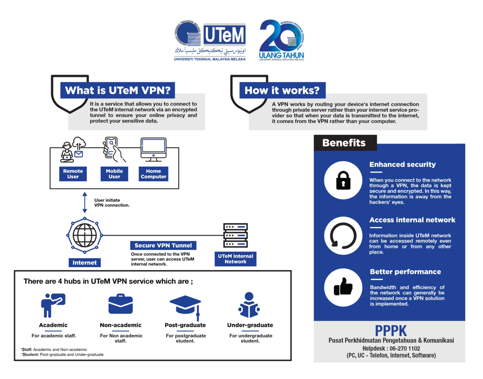 UTeM VPN service is exclusively for UTeM staff and students, with exceptions for third-party users granted permission by UTeM, such as outside vendors.